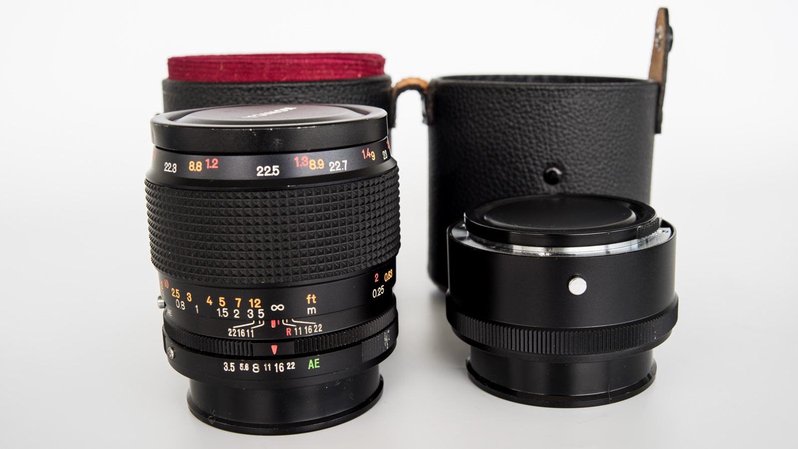 The lens focuses smoothly and is mechanically functional in every respect and allows for full aperture control for both auto and manual mode use, on oil-free blades. The included 1:1 Macro Extension is the original automation-enabled version designed for this lens only, and it works as designed. An added feature of this extension is to spin the lens mounting 180 degrees, and positions a second set of focus scales and lens markings into their proper readable position to reflect the settings in use with this extension. This lens and extension tube set will operate on any Konica AR mount body, or will also work equally well on many digital bodies with an appropriate adapter.